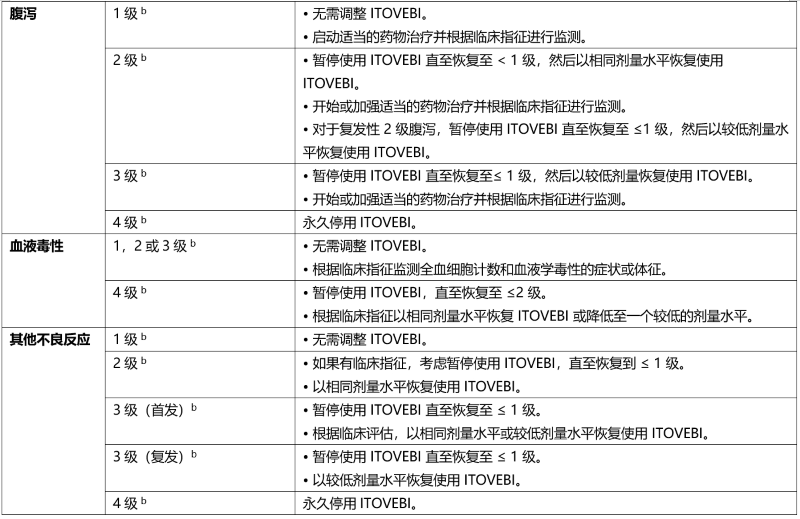 表 2 总结了针对不良反应的 ITOVEBI 剂量调整建议。